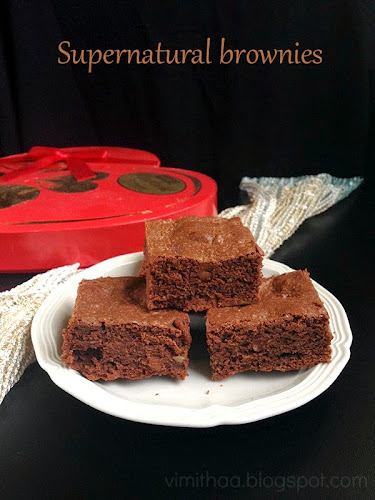 And so I baked it again yesterday for our sweet celebration. One thing that went wrong was that I baked it a tad bit more and the brownie became a bit dry and crumbly. The flavor was spot on and it was dense as any brownie should be but that moistness was no longer there. As a brownie lover, I would always perfer an underbaked brownie than an overbaked one. That being said, my advice would be to always test your brownie 2-3 mins before the said time and act accordingly. I will be trying this recipe soon to get that 'supernatural' effect and will update the pictures when I do so.